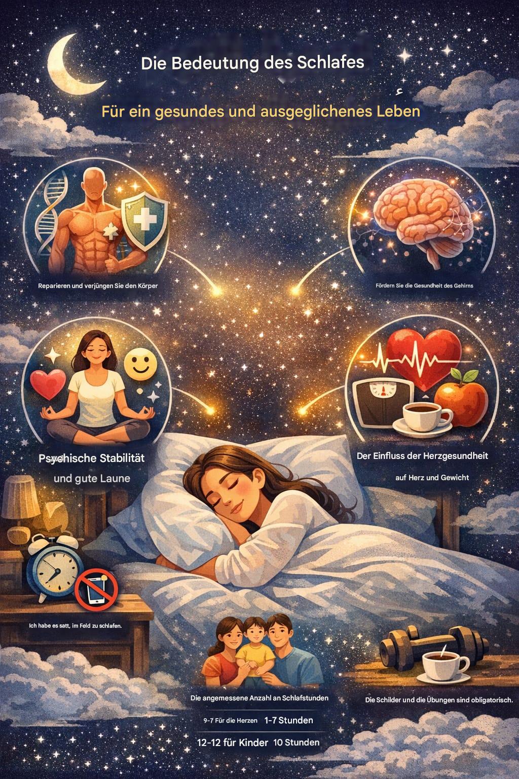 Ein weiterer wichtiger Aspekt ist die Wirkung des Schlafs auf die psychische Gesundheit. Schlafmangel kann zu Stress, Angstzuständen und Depressionen führen und macht den Menschen oft reizbarer und emotional instabiler. Im Gegensatz dazu trägt ausreichender Schlaf zu einer besseren Stimmung, innerer Ruhe und emotionalem Gleichgewicht bei. Daher ist es sehr wichtig, täglich genügend Schlaf zu bekommen, um die psychische Stabilität zu erhalten.